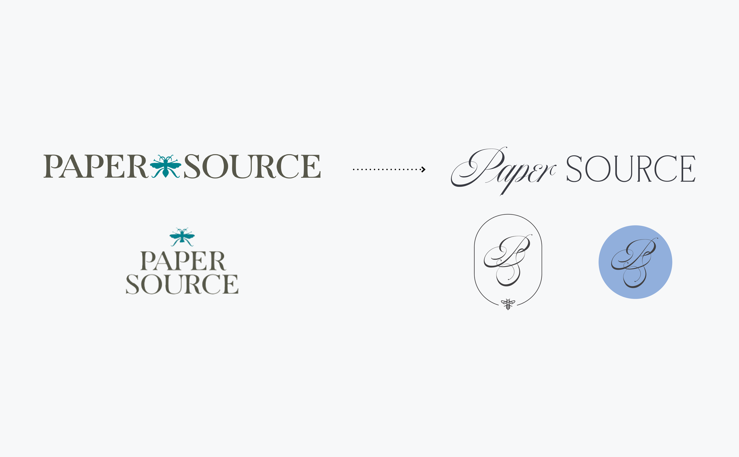 Next, we thought about all the different uses that Paper Source has for their brands. Everything from store signage, employee apparel, the website—the branding all had to look cohesive across the board, while being flexible enough to work in whatever medium they needed. We took elements from the main logo, and crafted an abbreviated mark that could be used in smaller spaces (like social media or letterhead), and had a nod to the original logo with the addition of the wasp graphic.