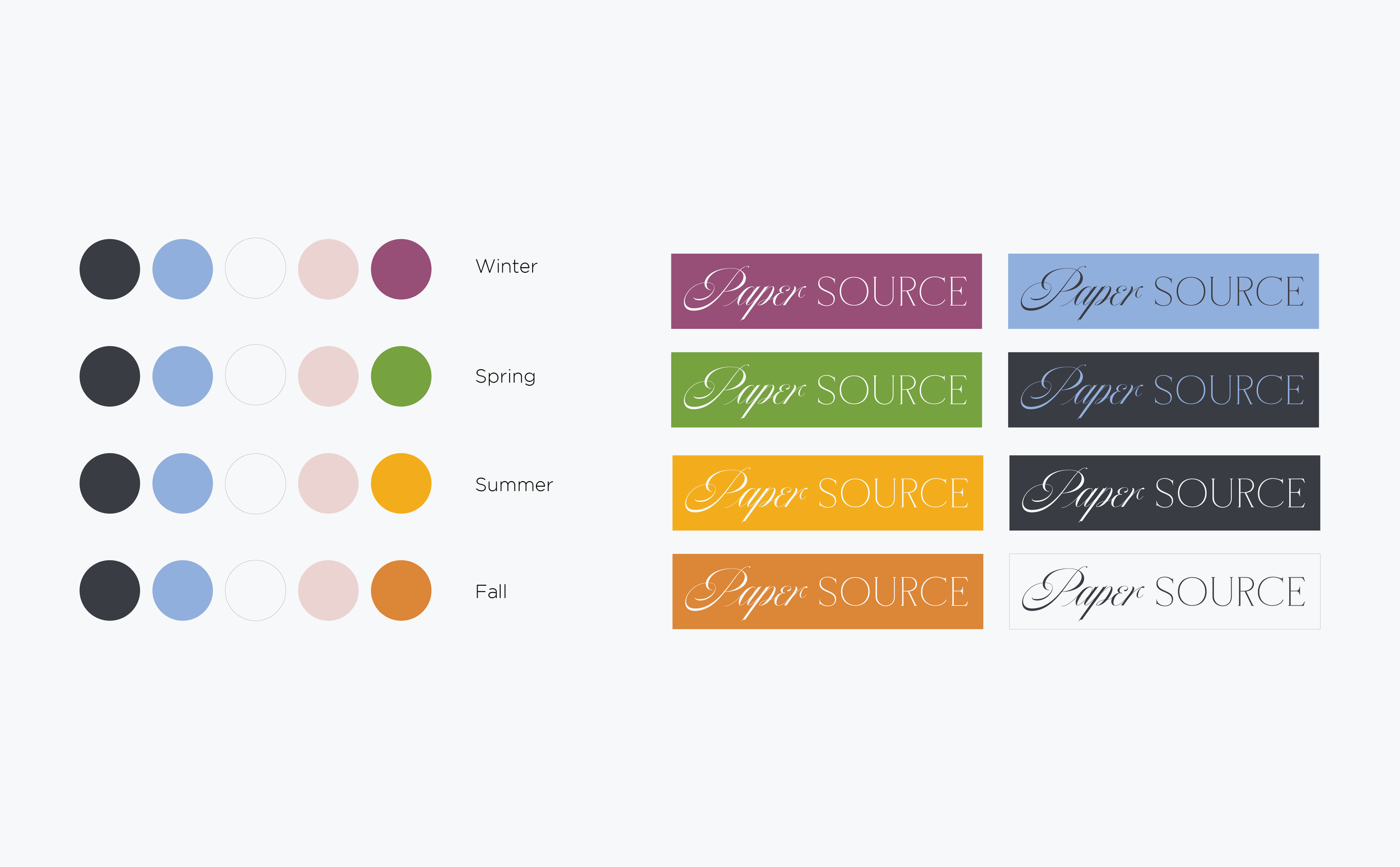 Another key part of the Paper Source business is their seasonal offerings. When we began to explore a color palette for the re-brand, it was impossible to put just one palette together that captured the sheer breadth of products that they offer for each season and holiday. So, we figured why limit ourselves to just one?