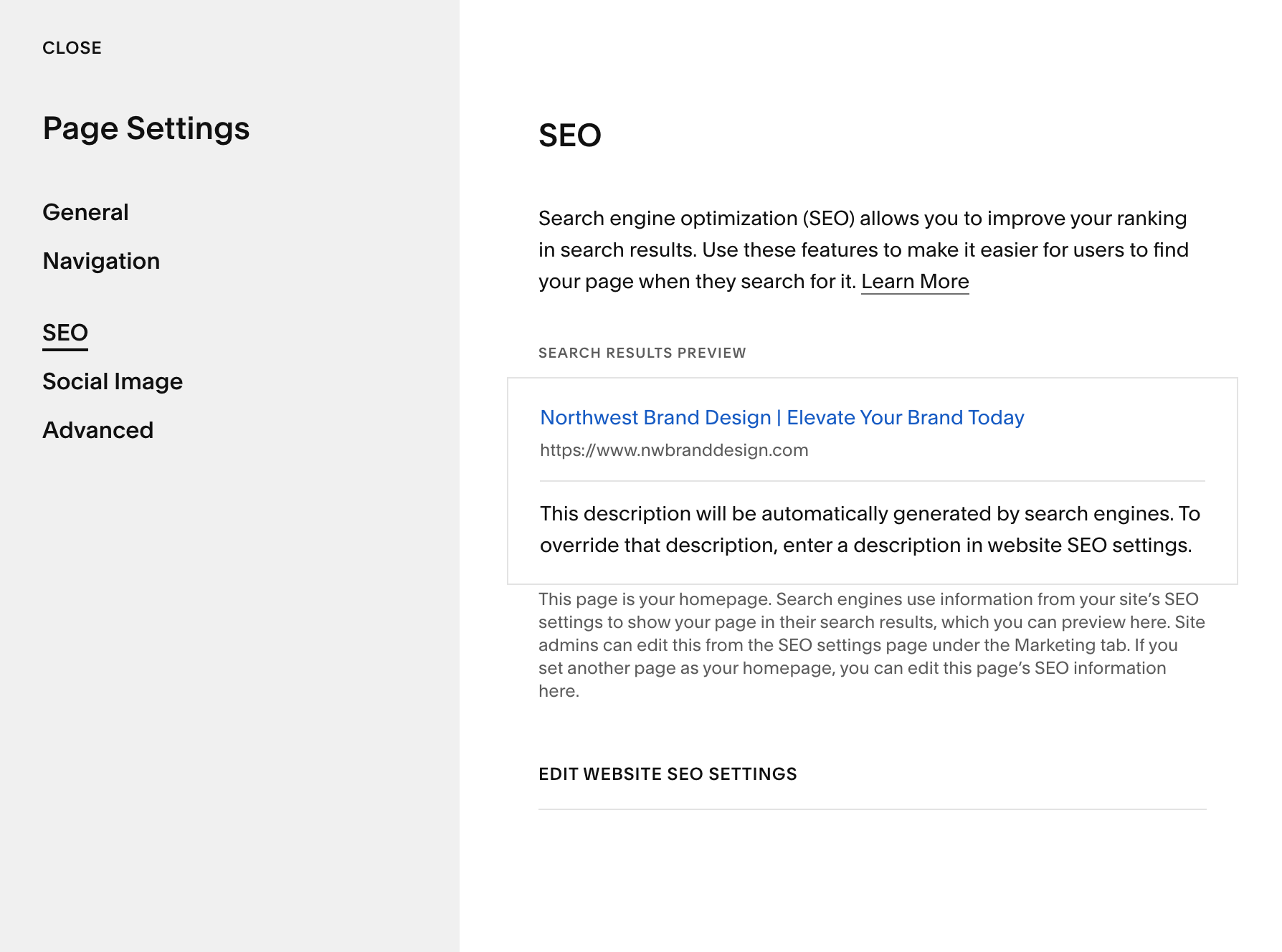 Finally, make sure to always customize your page titles and meta descriptions. Squarespace makes this simple in Page Settings → SEO. Clear, keyword-informed metadata boosts your click-through rate and helps Google deliver your content to the right audience.